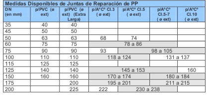 * Aptos para caños de PVC, de Asbesto Cemento, De Hierro Fundido, (Ver Tablas con medidas y usos disponibles)