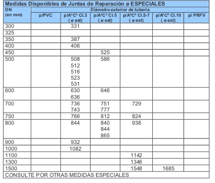 * Aptos para caños de PVC, de Asbesto Cemento, De Hierro Fundido, de PRFV, (Ver Tablas con medidas disponibles)